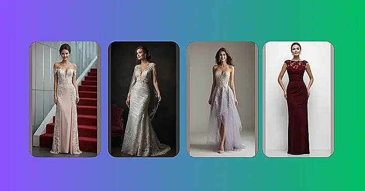 You know that awkward feeling when you’re invited to a wedding and realize your wardrobe mostly consists of hoodies and sweatpants? Well, stress no more about finding the perfect ‘latest wedding guest outfit’ because this look is an absolute winner! Our model here is rocking a gorgeous blue-grey mermaid-style dress, complete with delicate lace flowers that totally say, “I’m here for the love, the celebration, AND definitely the free cake!” It’s stylish enough to get compliments but subtle enough not to accidentally steal the spotlight from the happy couple, which, let’s be honest, is a major wedding guest goal.