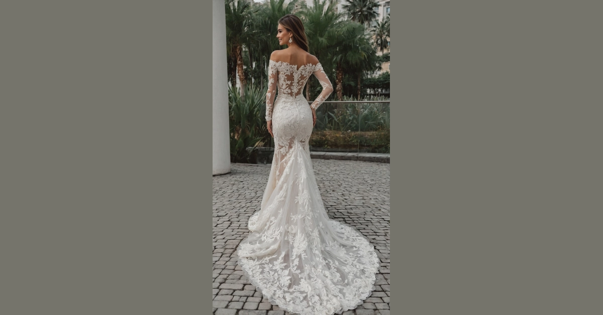 And check out all that gorgeous lace! It’s like a super intricate tattoo made of fabric, flowing all the way down to that awesome train. You might need a couple of friends (or even a small personal assistant) just to manage the fabulousness of that flowing bottom part, especially when you’re trying to bust a move on the dance floor. Just imagine trying to sneak a snack from the buffet in this masterpiece – pure mission impossible! But honestly, rocking an off-shoulder, long-sleeved, lacy trumpet dress like this? You’d feel so elegant, you might accidentally start speaking in a fancy accent. Totally worth any minor logistical challenges for looking this stunning!