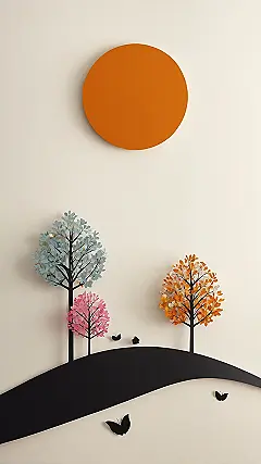 Searching for a wallpaper that’s so cute, it practically winks at you every time you open your phone? Take a peek at this awesome scene! We’ve got a giant, friendly orange sun, chilling out at the top like a perfectly round, delicious cookie. Below it, a super cool trio of trees is putting on a fashion show with their leaves – one rocking a chill blue, another totally feeling the pink vibes, and the last one showing off some dazzling orange. It’s like they’re all silently competing for ‘most stylish landscape’ on your screen, and honestly, they’re all winners!