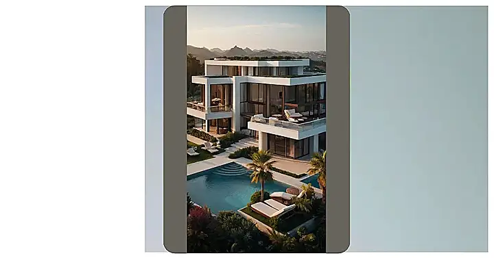 This picture shows a super cool villa. It’s so white and sleek, it looks like it could be in a movie! The house has a huge window that looks like it opens up right onto a pool – talk about a perfect place to chill! The house is so modern, it makes you think about all the awesome gadgets it might have inside. Maybe there’s a robot butler that makes you smoothies, or a secret room that turns into a disco!