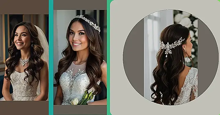 Planning your wedding hair can feel like trying to solve a Rubik’s Cube blindfolded! But guess what? This half-up style is like the cheat code. It’s sophisticated enough for walking down the aisle, but still lets your gorgeous hair flow freely. Plus, that sparkly hairpiece is totally stealing the show! You’ll be sparkling brighter than the disco ball at the after-party!