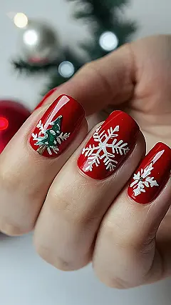These nails are seriously festive! Imagine walking into a Christmas party with these beauties – everyone will be asking where you got them done. That shiny red is the perfect Christmas color, and those little snowflakes? They’re like tiny works of art, making your fingers look like miniature winter wonderlands. It’s like wearing a little bit of Christmas magic on your fingertips. You’ll be ready to jingle all the way… to the next holiday party, that is!