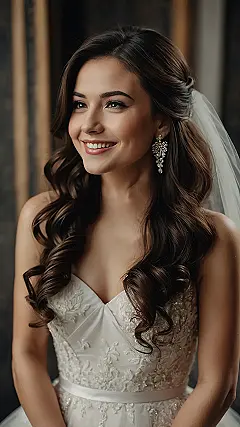 This stunning half-up, half-down hairstyle is basically the superstar of winter wedding looks. Just look at those beautiful, bouncy curls cascading down! It’s the perfect blend of practical and glamorous: the top half is neatly pulled back, so you won’t have any rogue strands flying into your face during the vows or getting caught in your cousin’s hug. Plus, all that gorgeous volume provides a secret layer of warmth around your shoulders, making you look effortlessly chic even when it’s frosty outside. It’s like your hair is saying, “I’m fancy, but also, I’m prepared for a snowball fight… just kidding, I’m a bride!”