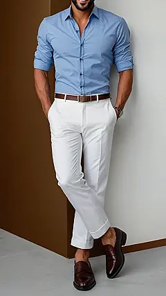 Looking sharp for a special occasion can be a little daunting, especially when you’re trying to find the perfect outfit. Think of it like a puzzle: you’ve got your shirt, your pants, your shoes, and a belt to tie it all together. This guy’s got it figured out, with his crisp blue shirt, perfectly pressed white pants, and brown leather loafers. It’s simple, classic, and definitely leaves a good impression.