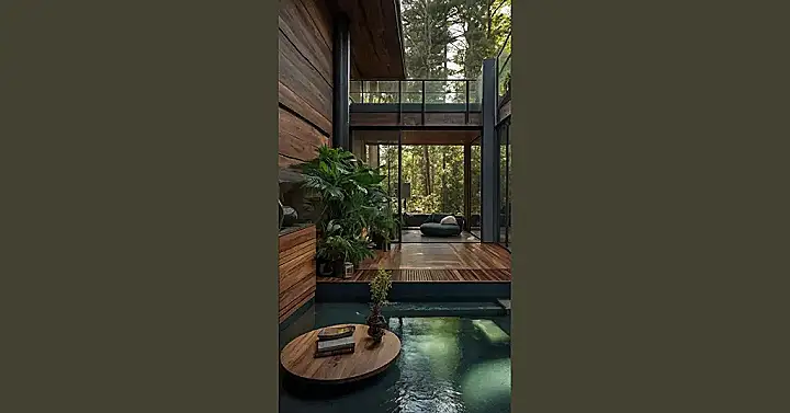 Imagine waking up in a house surrounded by tall trees, with a little pond right outside your door! This isn’t just a dream, it’s a modern house that blends perfectly with its natural surroundings. It’s like the house decided to become friends with the forest and they all decided to live together happily ever after. The house is made of wood, just like the trees, and it has big windows that let in lots of sunshine and beautiful views of the forest.