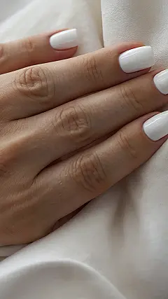 The image shows a hand with beautiful white nails. They’re so white, they practically glow! It’s like someone took a tiny paintbrush and carefully painted each nail with the perfect shade of white. Imagine if you could paint your nails that well. You’d be the envy of all your friends!