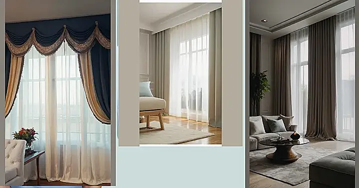 This picture shows a living room with some really nice curtains. They’re not your average boring curtains, though! They’re super fancy, with these long, flowing drapes that look like they’re straight out of a magazine. You can even see that the curtains are a different color on each side of the window – one side is light and airy, while the other is a little bit darker and more dramatic.