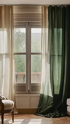 The image shows a beautiful living room with big, flowing curtains. They’re like the main characters in a play, but instead of performing on a stage, they’re gracing a window, making the whole room look extra fancy! The curtains are a mix of creamy white and a lovely shade of green, giving the space a relaxed and sophisticated vibe. It’s like a comfy blanket for the window, blocking out the bright sunlight and creating a peaceful atmosphere. You can imagine curling up in that comfy chair, reading a good book, and enjoying the quiet time.