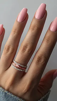 These nails are so pretty, they’re practically begging for a close-up! That soft pink shade is like a breath of fresh air, and it looks super chic with those sparkly rings. I bet they were a pain to put on though! Imagine trying to get those tiny diamonds lined up perfectly. It’s like a tiny jewelry puzzle!
