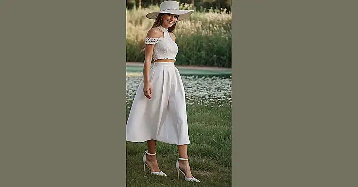 This outfit is like a breath of fresh air, all white and totally stunning. The girl looks like she’s ready to walk down the aisle or conquer the world, but in the most stylish way possible. It’s like she’s saying, “I’m here, I’m elegant, and I’m not afraid to show it!” That floppy hat just tops it all off perfectly, like she’s about to take on the world in a stylish and confident way.