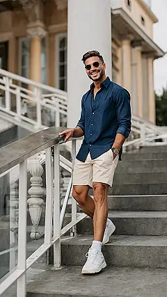 This guy is rocking a totally awesome outfit that’s perfect for summer. It’s the kind of look you can wear on a date, to a BBQ, or even just to hang out with your friends. Imagine you’re walking down the street in this outfit, feeling like a total boss. You’ve got the shades on, the breezy button-down shirt, and those comfy shorts. It’s like you’re ready for anything!