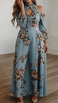 This outfit is like a walk through a Parisian garden in the fall! The blue and floral print screams “chic” while the long sleeves and pants keep you warm as the weather cools down. It’s like you’re wearing a bunch of beautiful flowers, but without the pollen and the bees buzzing around your head. Plus, those high heels give you a sophisticated air that’s perfect for strolling around the cobblestone streets of Europe.