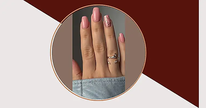 These nails are like a fancy autumn picnic! The soft pink is like a warm, fuzzy sweater, and the gold glitter is like the sparkling leaves on the trees. They’re just begging for a walk in the park or a pumpkin spice latte, don’t you think?