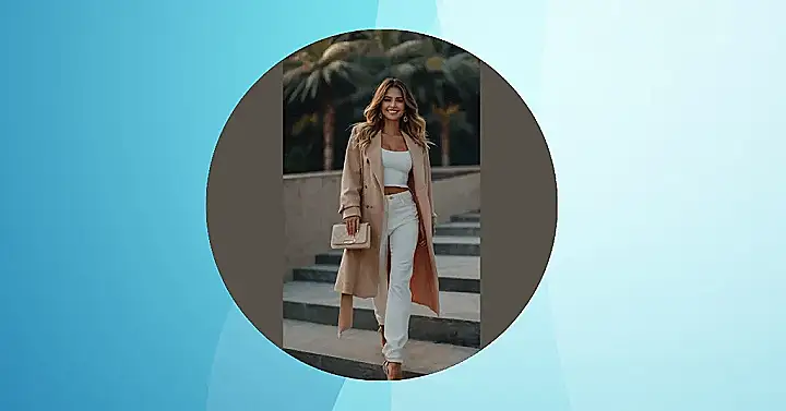 This picture shows a girl rocking a stylish fall outfit! She’s got the perfect mix of cozy and chic, making her look super fashionable and ready for anything. Her comfy white pants and cute top are perfect for layering under that stylish beige trench coat, which is a must-have for fall. Plus, the cute bag adds a touch of personality and she’s totally rocking those golden earrings! It’s like she’s ready to strut down the street and turn heads with her effortlessly cool outfit.