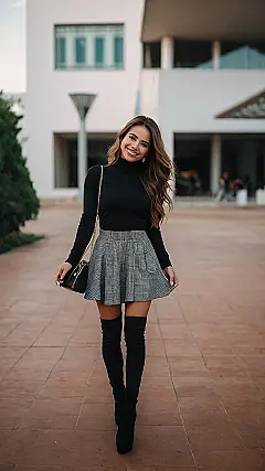 This girl knows how to rock fall fashion! She’s got on a cute black turtleneck and some totally rad plaid shorts. But the real show-stopper is those thigh-high boots! They’re like a fashion statement that says, “I’m ready for the cooler weather, but I’m still keeping it chic.” She’s practically defying the weather with those shorts, and those boots just make the outfit extra awesome!