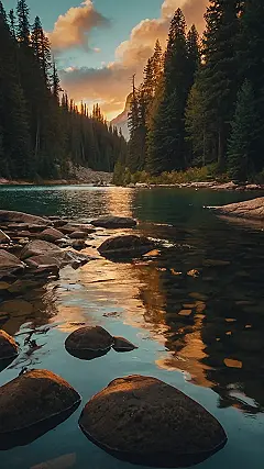 This picture is like a scene straight out of a fairytale! It’s got everything: a crystal-clear river, a whole forest of towering trees, and a sky that’s on fire with the colors of the sunset. The water is so still, it acts like a giant mirror, reflecting the sky like it’s a painting. It’s almost like the whole forest is holding its breath to watch the sunset, and the river is just chilling out, soaking it all in.