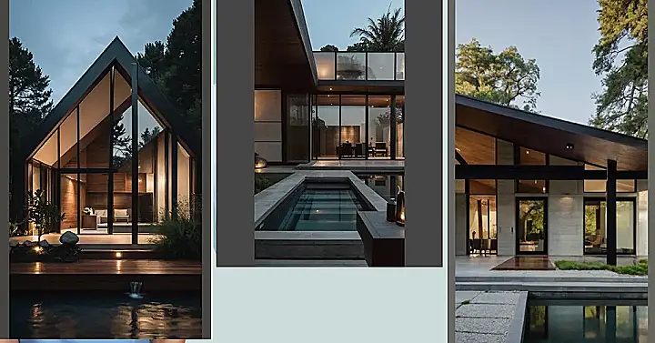 This house is like a giant window frame, showcasing the beautiful trees and the starry night sky. It’s got all the important stuff, like a comfy couch and a cool pool, but it’s super simple and sleek. No clutter, no distractions, just the peace and quiet you need to relax and enjoy the scenery. It’s like living in a nature magazine, but with a super fancy, modern twist!