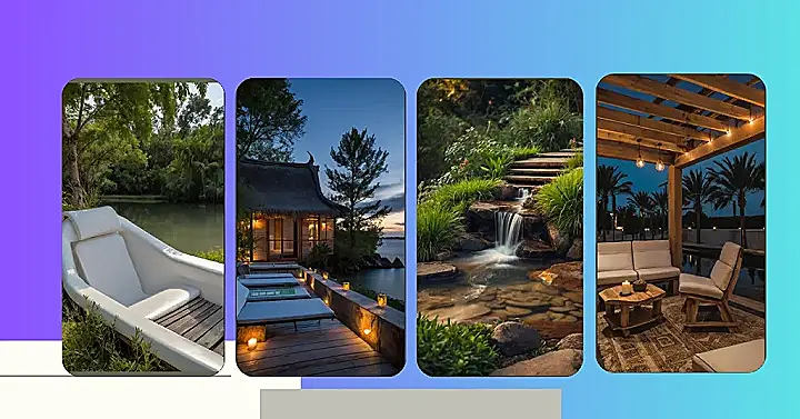 This picture screams “relaxation”! Imagine yourself sipping a lemonade on that comfy-looking porch swing, with the soft glow of the lights and the peaceful sound of water lapping against the wooden deck. It’s like a scene out of a movie, except you get to be the star!