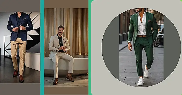This guy knows how to rock a formal outfit! He’s got the green jacket on, the crisp white shirt, and those perfectly tailored pants that make him look like he’s ready for a fancy dinner or a night out on the town. Plus, the brown shoes are the perfect finishing touch, like the cherry on top of a delicious sundae!