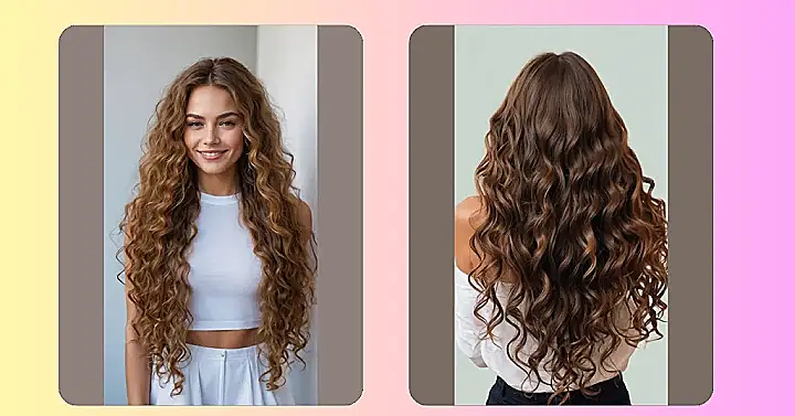 This picture shows a girl with long curly hair, and it’s like a waterfall of beautiful brown waves! She looks amazing, right? You know how sometimes people say, “Oh, my hair is so frizzy?” Well, this lady’s hair isn’t frizzy at all. It’s got a super cool, natural, mermaid vibe. Maybe she’s a secret mermaid who came up from the ocean just to show off her awesome hair? Either way, it’s clear that long curls can be super stylish. It’s like she’s ready for a photoshoot on the beach, or a day at the salon, or maybe even a date with a super cool mermaid prince!