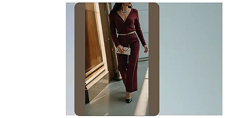 This outfit is like a secret weapon for looking super stylish without even trying too hard. It’s the perfect mix of laid-back and elegant, kind of like that friend who always looks effortlessly cool. The maroon pants and blouse are like a cozy, sophisticated hug, while the dainty necklace and little clutch add a touch of “I’ve got this” confidence. It’s the kind of look that screams “I’m not trying too hard, but I look amazing!”