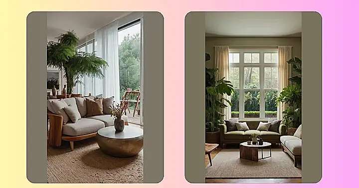 Imagine you’re chilling in a comfy couch, surrounded by fluffy pillows and a big ol’ plant wall that looks like it escaped from the Amazon rainforest! That’s kind of what this living room is like. It’s got that super cool “Nature Living Spaces” vibe, with tons of greenery and wooden furniture that makes you feel like you’re stepping into a cozy treehouse.