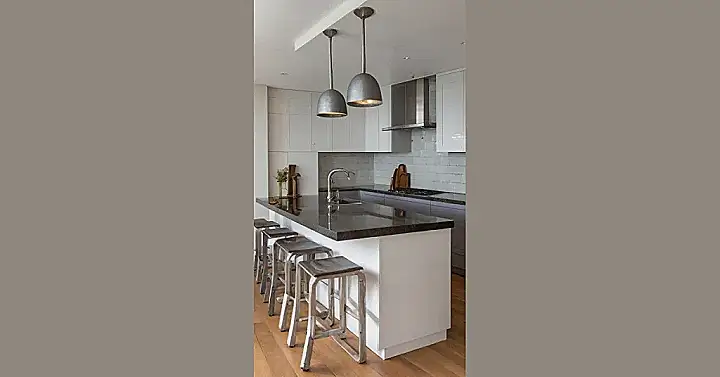 I wouldn’t mind hanging out at this kitchen island, sipping some juice and chatting with friends. Those comfy leather stools look perfect for hanging out, and the bright light from the ceiling makes everything look so clean and inviting. This kitchen is the perfect spot to create memories with family and friends, and I bet everyone who walks in will be jealous of this cool, new kitchen!