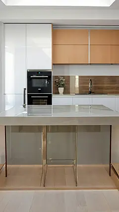This kitchen remodel is seriously cool. Check out the countertop – it’s like a magic trick! When you need extra space, it folds down to create a big work area, and when you’re done, it slides back up to make the kitchen look super clean and organized. It’s like having two counters in one!