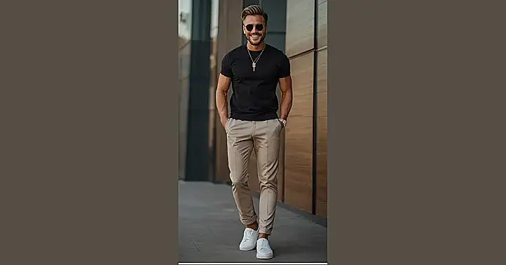 This guy’s got the look down, no doubt! He’s rocking a classic black t-shirt, which is like the hero of any casual outfit. It’s simple, but totally cool. And those tan pants? They’re like the sidekick, adding some sophistication to the whole thing. You could wear this look to school, to hang out with friends, or even to a fancy restaurant if you’re feeling daring!