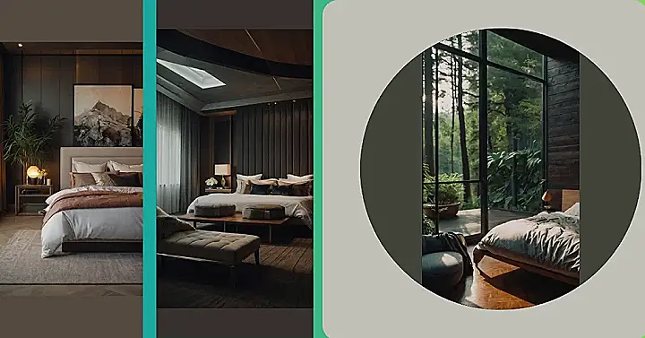 This bedroom looks like it was plucked straight out of a nature magazine! The dark walls are like a cozy forest, and the artwork with the leaves and branches gives you that feeling of being surrounded by nature. The fluffy bed with the furry blanket is like a comfy cloud waiting to be snuggled into. It’s the perfect place to escape from the daily grind and relax like a bear hibernating for the winter.