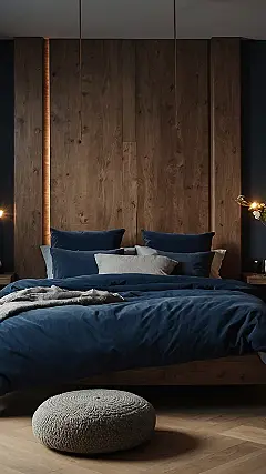 This bedroom is like a cozy cabin in the woods, even if it’s in the middle of the city! The wood paneling on the wall makes you feel like you’re surrounded by trees, and the dark blue bedding is like the sky at night. It’s the perfect place to curl up with a good book and forget about all your worries.
