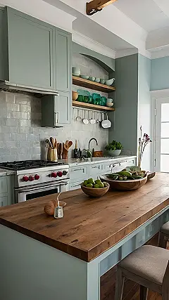 This kitchen looks like it’s straight out of a magazine, and it’s making me crave a home-cooked meal! Just look at that gorgeous wooden countertop – it’s like a giant, inviting table waiting for a feast. And those mint green cabinets? Seriously, they’re giving me serious kitchen envy! You could totally imagine whipping up a delicious meal in this kitchen while listening to some good tunes.