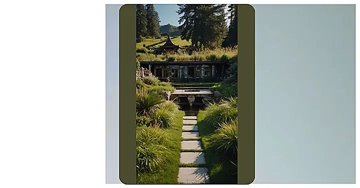 This house is so fancy, it even has its own little pond! It looks like a perfect place to chill out and forget about all your worries. Imagine yourself relaxing by the pond, watching the sun set and listening to the birds chirping. The house has a big green door, which is pretty cool. I wonder what’s behind it, maybe a super secret room with a hidden treasure? Or maybe just a big, fancy kitchen that smells like cookies. Either way, this house is definitely a dream come true!