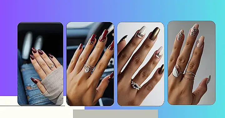This fall, forget the boring old pumpkin spice latte ‚Äì your nails are about to get a royal makeover! Forget those basic solid colors ‚Äì these nails are rocking a fancy burgundy with shimmery gold details. It’s like a fancy Thanksgiving dinner on your fingertips, but way cooler!