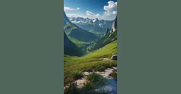 Imagine you’re a brave adventurer, trekking through this breathtaking landscape. You hear the whisper of the wind through the trees and the gurgling of a river, and you smell the sweet scent of wildflowers. The path before you stretches out into the distance, promising exciting discoveries around every bend. With every step, the mountains seem to whisper their secrets, urging you to explore their ancient magic.