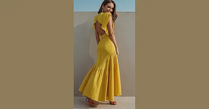 This dress is like a ray of sunshine on a cloudy day! It’s bright yellow, flowing and fun – perfect for a day out with friends, a picnic in the park, or maybe even a special occasion (if you’re feeling fancy!). The open back gives it a little extra pizzazz, and the flouncy skirt makes you want to twirl! It’s definitely a dress that will make you feel confident and ready to take on the world, or at least the school dance.