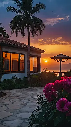 This picture is like a scene straight out of a dream! Imagine waking up to this beautiful sunrise painting the sky in shades of pink and orange. It’s like the sun is giving a big “good morning” to the world! The palm tree looks like it’s waving back at the sun, and the flowers are all wide awake, ready to soak up all that sunshine. It’s the kind of view that makes you feel relaxed and happy, like you could just sit there all day and watch the world wake up.