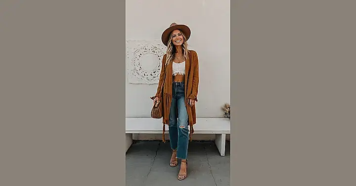 This outfit is giving us major fall vibes! The brown cardigan with those cute tassels is perfect for layering over a simple white top. And those jeans? They’re totally ripped and ready for anything. The hat is the cherry on top, making this look super boho and chic. You could totally rock this outfit to a pumpkin patch or apple orchard, or even just to hang out with friends. It’s comfy, stylish, and totally on-trend!