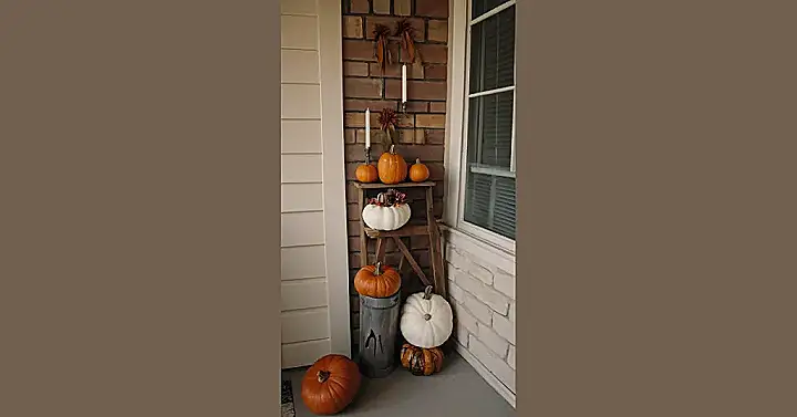 This porch is ready to welcome autumn with open arms (and maybe a little pumpkin spice latte). Look at all those cute pumpkins! They’re like a little family of gourds, all decked out in their finest fall colors. The white pumpkin with the little orange and brown friends on top is giving us major fall vibes. It’s like the pumpkin version of a Thanksgiving feast! And don’t forget the candles – they’re like a warm hug on a chilly autumn evening.