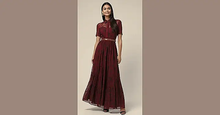 This dress is basically begging to be worn on a crisp fall day. The rich burgundy color is perfect for autumn, and the flowing maxi style is so comfy and stylish. Imagine yourself strolling through a pumpkin patch in this dress – you’d definitely be the most fashionable scarecrow around! Plus, the sheer top and collared button-up look super chic, like you just stepped out of a magazine. You could totally pair it with a cozy cardigan and ankle boots for the ultimate fall look. You’ll be the envy of all your friends!