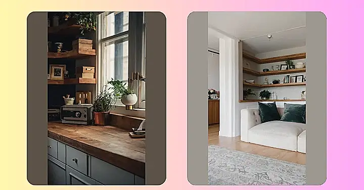 This room is like a breath of fresh air! It’s so clean and simple, it almost makes your brain feel organized just by looking at it. No clutter, just a few carefully chosen pieces. Those wooden shelves are like the perfect backdrop for a small collection of art and plants, just enough to make it interesting without being overwhelming. It’s like the room is saying, “Hey, let’s just chill and enjoy the peace and quiet, okay?”