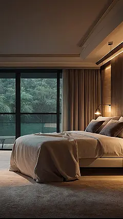 This picture shows a cozy and inviting bedroom with a large window overlooking a beautiful green forest. The room has a calming and peaceful vibe, perfect for relaxing after a long day. You can imagine waking up in this room, with the sunlight streaming through the window and the sounds of birds chirping in the trees.