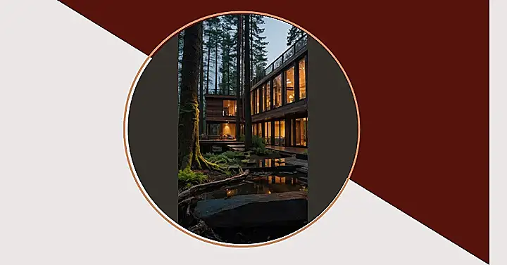 Imagine waking up to the sounds of birds chirping and sunlight streaming through the roof of your living room. This isn’t some fancy dream, it’s real life! The image shows a cozy living space that’s practically part of the forest outside. The huge windows bring the greenery right inside, and the wooden beams and floors make it feel like you’re surrounded by nature. It’s like a little slice of the great outdoors, but with comfy couches and warm lights.