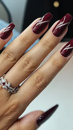 These nails are giving us major “fancy dinner party” vibes! The rich burgundy color is super elegant, and the white lines add a touch of pizzazz. It’s like someone took a fancy pen and drew all over their nails, which is way cooler than it sounds! No more boring, chipped nails, these gel nails are here to stay for weeks!