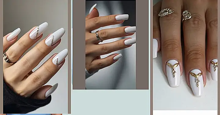 The white nails are just the perfect blank canvas for the gold details to really shine! And let’s not forget the rings! They’re just as beautiful as the nails. It’s like a whole outfit for your fingers, all sparkly and sophisticated. You can bet that anyone who sees this is going to want to know where you got them done, because they’re absolutely stunning!