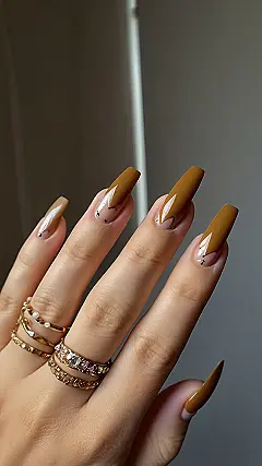 Okay, let’s be real, these nails are totally screaming “FALL!” They’re like a warm cup of pumpkin spice latte for your fingertips. And with those sparkly rings, it’s like you’re channeling some serious autumnal royalty! Who needs pumpkin spice lattes when you can have sparkly sunshine nails, right?