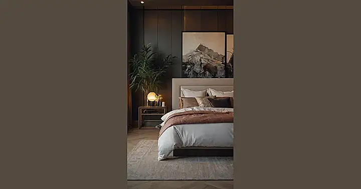 This bedroom looks like it was plucked straight out of a nature magazine! The dark walls are like a cozy forest, and the artwork with the leaves and branches gives you that feeling of being surrounded by nature. The fluffy bed with the furry blanket is like a comfy cloud waiting to be snuggled into. It’s the perfect place to escape from the daily grind and relax like a bear hibernating for the winter.
