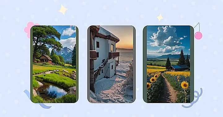 This image is like a postcard from a fairytale! A cute little wooden cabin sits right next to a sparkling lake, surrounded by lush green fields and majestic mountains. It’s a perfect scene for a storybook โ maybe about a brave little girl who discovers a secret hidden in the forest. The air is fresh, the sky is blue, and the clouds look so fluffy you want to jump on them.