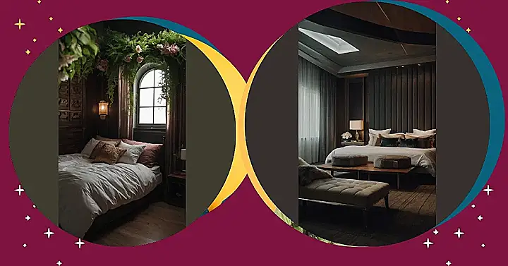 This bedroom looks like it was plucked straight out of a nature magazine! The dark walls are like a cozy forest, and the artwork with the leaves and branches gives you that feeling of being surrounded by nature. The fluffy bed with the furry blanket is like a comfy cloud waiting to be snuggled into. It’s the perfect place to escape from the daily grind and relax like a bear hibernating for the winter.
