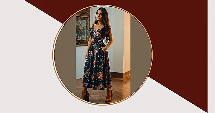 This floral dress is like a magical potion: It makes you feel like a princess going to the prom, but also super chill and ready for a picnic in the park. The dark background lets those beautiful flowers really pop, and the loose, flowy fit is just begging for you to twirl around in. Plus, it’s got pockets! Seriously, pockets are the ultimate fashion upgrade. And those boots? They’re like the cherry on top of a delicious sundae – they add a touch of “I’m not messing around” that totally balances out the girly vibes of the dress.